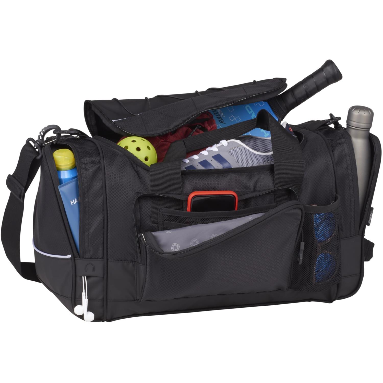 The Wenger Apex 20” RPET Sport Duffel is rugged enough for all of life’s adventures, not to mention super roomy! This durable duffel bag features a spacious main compartment, plus two large zip pockets, a front pocket and a mesh water bottle pocket. Perfect for carrying your workout clothes, travel gear, toiletries and more. A front organizer zip pocket is ideal for keys, smartphone, ID, pens, and pencils while a bungee-cord system can cinch an extra pair of shoes and other equipment. Through a partnership with 1% For The Planet, one percent of all EcoSmart® sales are donated to environmental nonprofits. 9.00″ D x 20.00″ W x 11.50″ H